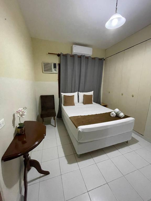 "Quarto super espaçoso, climatizado, cama confortável, banheiro gostoso, funcionárias super simpáticas, cafezao da manhã. Vende bebidas, cigarro, comidas rapidas... Tava tendo festa e as 22h parou. Nota 10."
